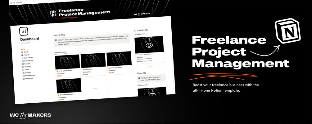 This Notion template helps freelancers like you to run and grow your business. This professional Freelance Project Management is all you need! Stay hyper organised and manage tasks, clients, projects, invoices, proposals all in one location and track your finances like never before.