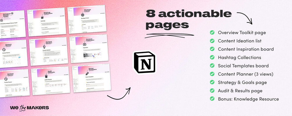 This Toolkit will not only help planning your content, but also accumulate ideas, connect your Instagram templates, find the most effective hashtags for each category and so much more. Easy to understand & easy to use. All you need is a Notion account. Each page includes instructions and helpful tips we gathered over the years building accounts with 300k+ followers...